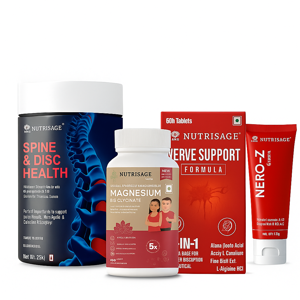 Yes! The Nutrisage Nerve & Disc Repair Combo is specially designed to support spine and nerve health. The Spine Disc Health Powder nourishes and strengthens the spinal discs, while the Nerve Support Formula helps calm irritated nerves and improve nerve signaling. Magnesium Bis-Glycinate+ relaxes muscles and reduces nerve-related discomfort, and the NERO-Z Nerve Relief Cream provides fast-acting, targeted relief. Together, they help manage sciatica, disc bulge, and pinched nerve pain while also reducing numbness, tingling, and burning sensations in the legs or arms over time with consistent use.