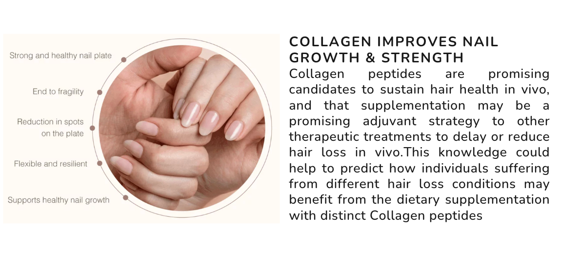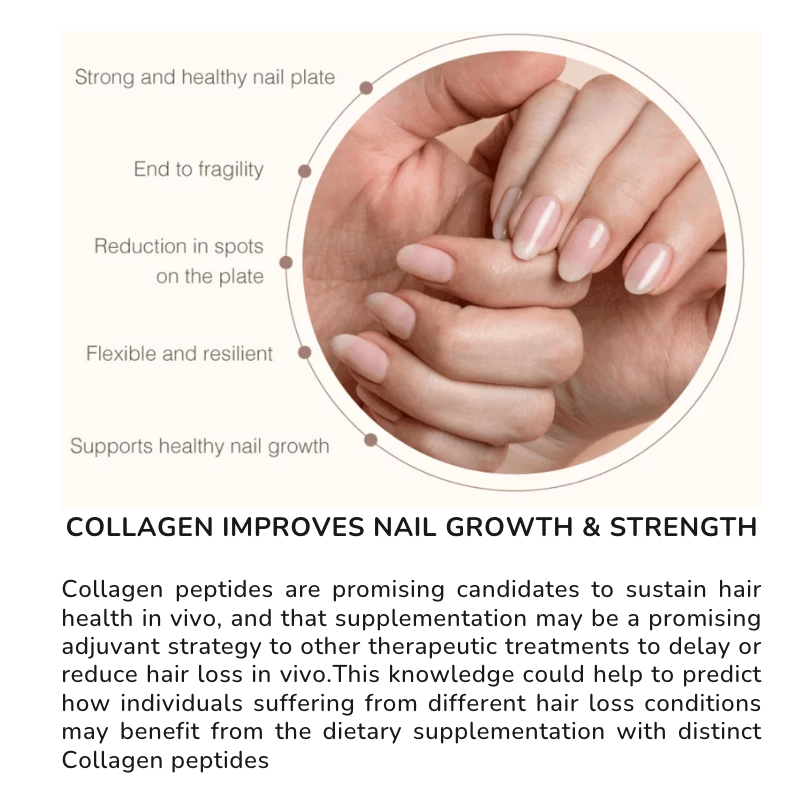 Hair and Nails – as collagen production slows, hair and nails can become brittle and weak. Collagen can help hydrate your hair and nails, helping them grow faster and thicker.