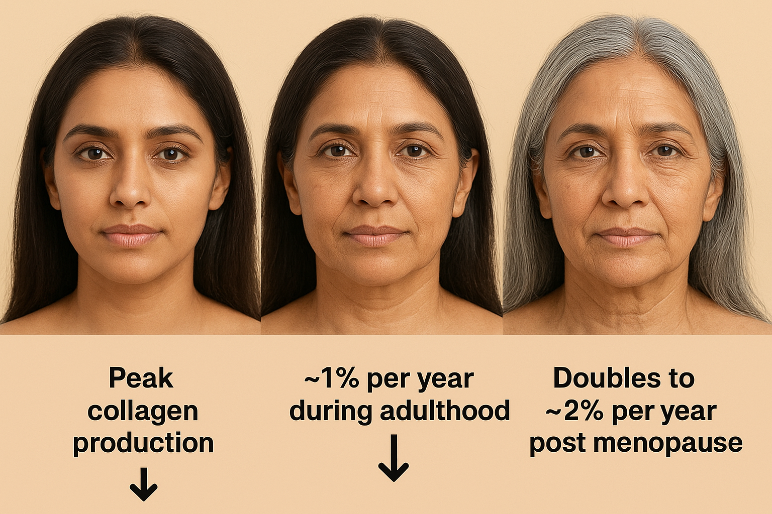 Multi collagen is a blend of different types of collagen (commonly Type I, II, III, V, and X), which together support the body’s structural and functional health. Collagen is the most abundant protein in the body, forming the foundation of skin, hair, nails, joints, bones, and connective tissues. Collagen loss is a real, measurable process that steadily worsens with age (≈1–1.5%/yr in skin studies) and contributes to internal structural decline in bone, cartilage, tendons, ligaments and vessels.