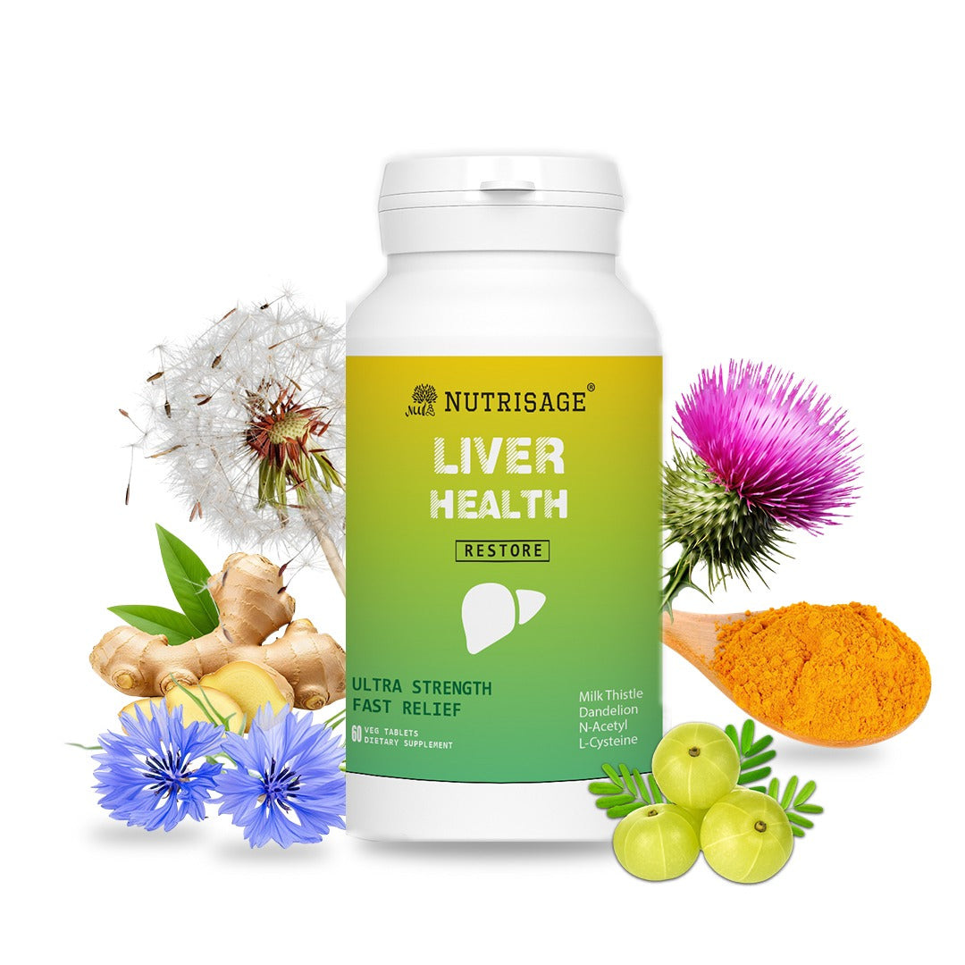 Nutrisage Liver Health Detox & Repair supplement I Natural Herbal Blend with Milk Thistle, Dandelion, NAC, ALA, Chicory, Turmeric, Ginger, Zinc, Choline, Vit E and Bhui Amla I 60 Tablets