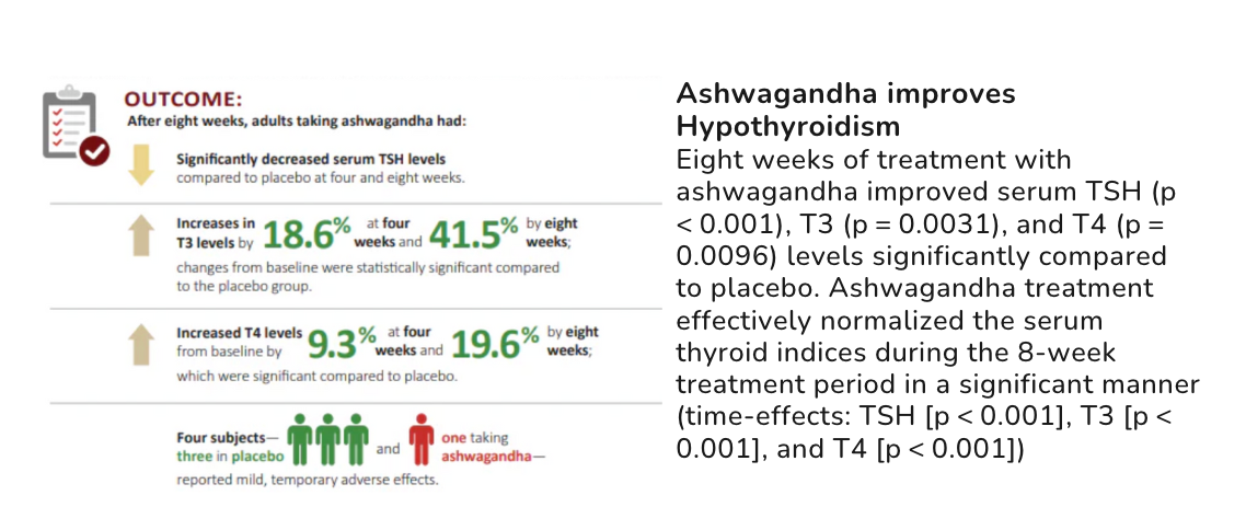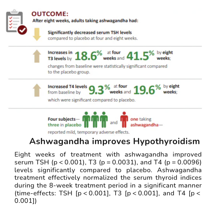 Ashwagandha is an adaptogenic herb that helps the body manage stress. It may stimulate thyroid function and support the conversion of inactive T4 into active T3, improving energy, metabolism, and mood in hypothyroid patients.