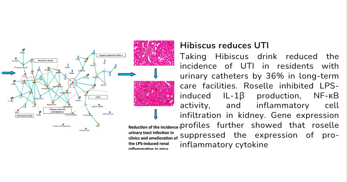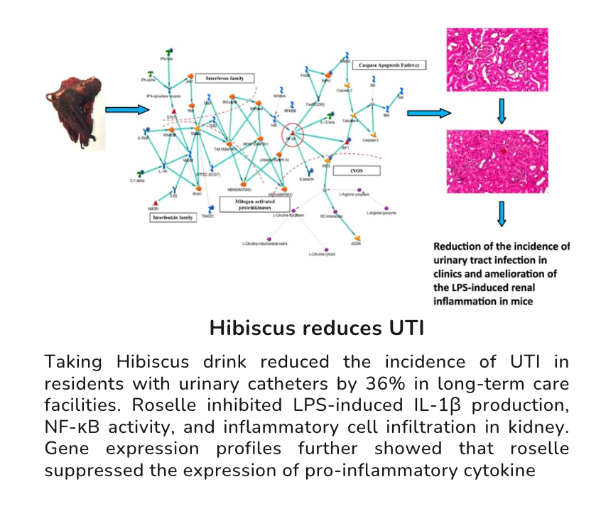 Hibiscus helps in urinary tract infections (UTIs) mainly due to its antimicrobial and diuretic properties. It contains natural compounds like proanthocyanidins and organic acids that inhibit the growth of bacteria, including E. coli, which is the most common cause of UTIs. Its mild diuretic effect increases urine flow, helping flush out bacteria and toxins from the urinary tract. Additionally, hibiscus is rich in antioxidants and has anti-inflammatory effects, which soothe irritation in the bladder and support overall urinary health, reducing the risk of recurrent infections.