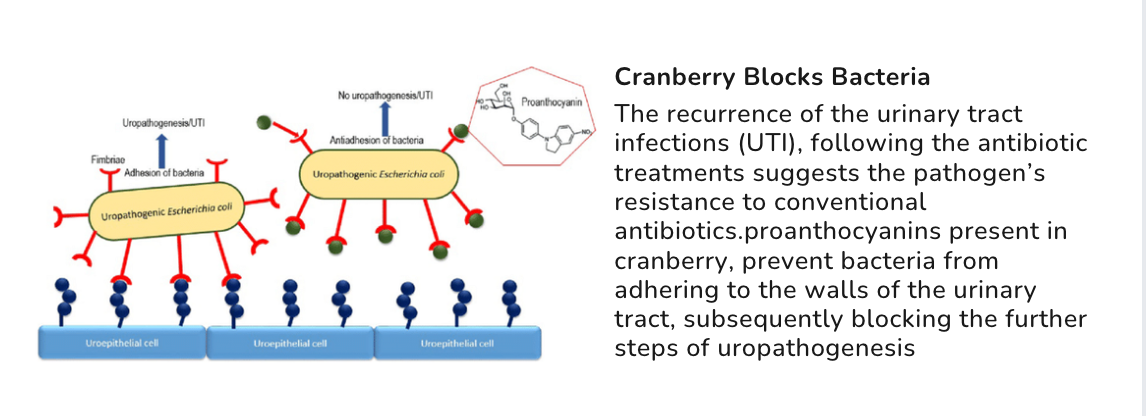 Cranberry helps in urinary tract infections (UTIs) by preventing harmful bacteria, especially E. coli, from attaching to the walls of the bladder and urinary tract. This is due to compounds called proanthocyanidins (PACs), which block bacterial adhesion and make it easier for the body to flush them out during urination. Cranberries also provide antioxidants that reduce inflammation and support urinary tract health. While they don’t act like antibiotics, regular use of cranberry juice or extracts may help lower the risk of recurrent UTIs and support natural defense against infection.