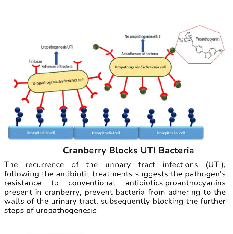 Cranberry extract is rich in compounds called proanthocyanidins (PACs), which prevent bacteria from adhering to the walls of the urinary tract. This anti-adhesion property makes it harder for bacteria to multiply and cause infection. In addition, cranberries are packed with antioxidants that help reduce inflammation, soothe the bladder, and support overall urinary tract health, making it a gentle and natural preventive aid against recurrent UTIs.