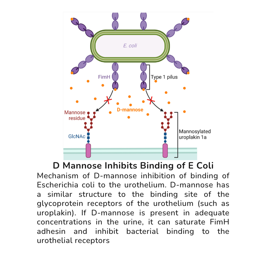 D-Mannose is a natural sugar that plays a key role in urinary tract health. Most UTIs are caused by E. coli bacteria, which stick to the bladder walls and multiply, causing infection. D-Mannose attaches itself to these bacteria, preventing them from clinging to the bladder lining. Once bound to D-Mannose, the bacteria are naturally flushed out through urine, helping reduce infection, discomfort, and the risk of recurrence.